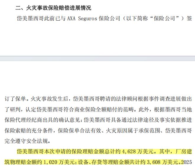其中,厂房建筑物理赔金额约1020万美元;设备、存货等理赔金额共计约3608万美元。